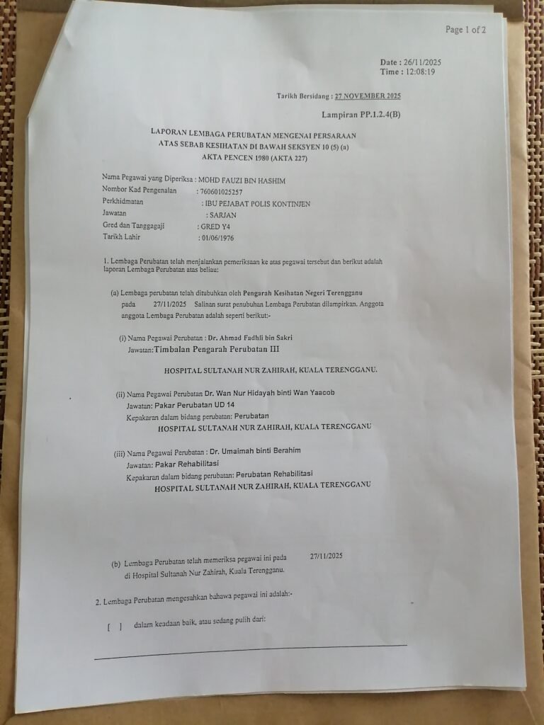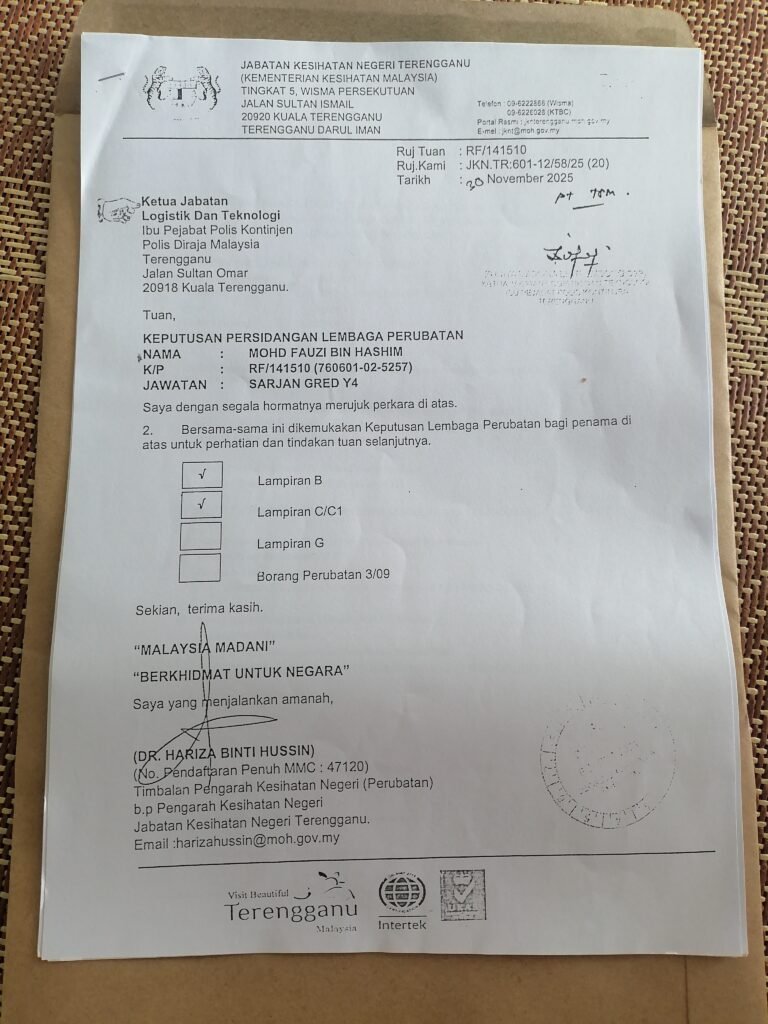 Saya mengambil MC selama setahun lebih untuk pulih sehingga 90℅ sebelum masuk bertugas. Namun akibat dari itu, saya telah menerima surat dari Jabatan Perubatan HSNZ untuk dipencenkan atas sebab kesihatan.